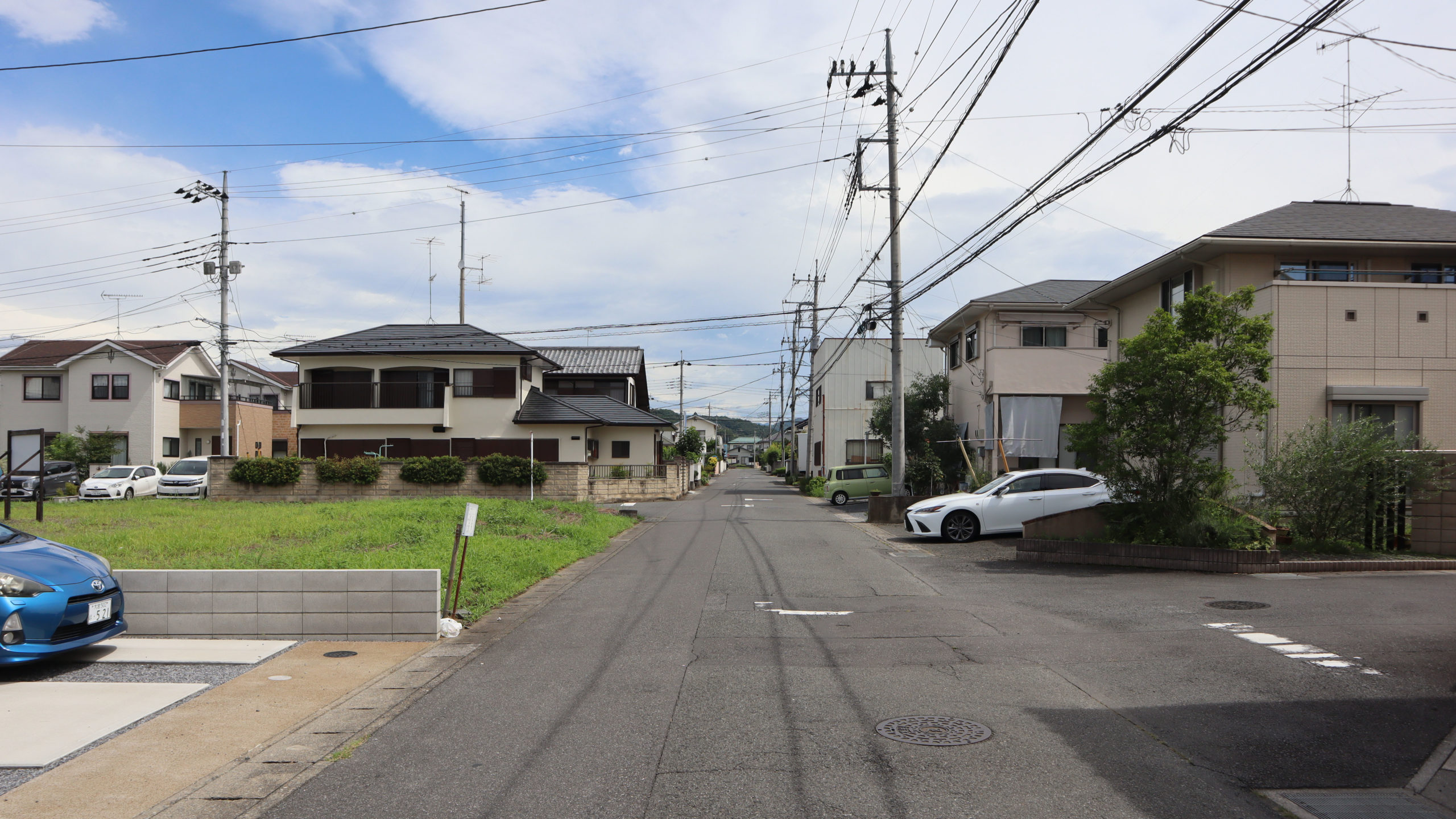 交通量の多い通りから一本入った住宅街にあり.東と北の2方向に接道する角地.